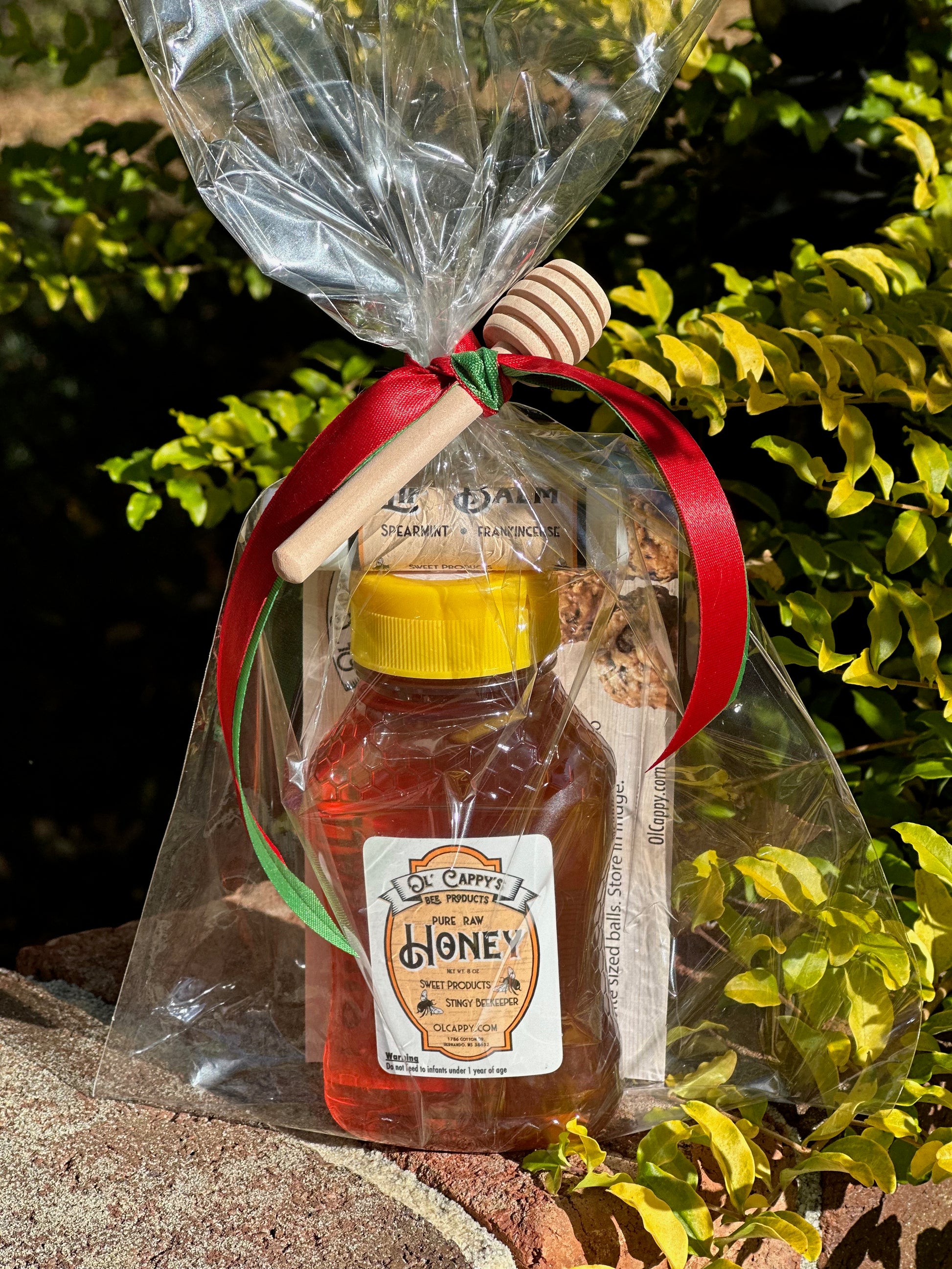 A sweet sampler of Ol’ Cappy a half pound of honey, beeswax lip balm, a honey dipper, and an Ol’ Cappy recipe card. A perfect taste of the hive!